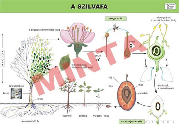 Oktató tabló, Környezetimseret 5. osztályos tanulók számára! Az oktató tabló részletesen bemutatja a szilvafa kialakulását a magtól-kezdve a gyökéren, törzsön, koronán, a virágzaton át. Ezt követően elemzi a megtermékenyítést és a szilva kialakulását.