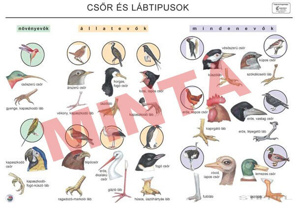 Bemutatás: Az oktató tabló részletesen szemlélteti a madarak csőr és lábtípusát. A madarakat három csoportba sorolhatjuk és ennek megfelelően szemlélteti a testrészeket. Az oktató tabló, lemosható műbőrre nyomtatva kerül értékesítésre.