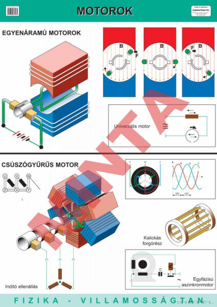 Bemutatás: Az oktató tabló részletesen szemlélteti az egyenáramú és a csúszógyűrű motorokat. Segítséget nyújt a diákoknak a tananyag elsajátításában. Az oktató tabló lemosható-műbőrre nyomtatva kerül értékesítésre.
