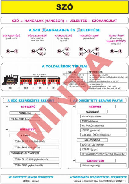Bemutatás: Az oktató tabló egy levezetéssel indul, amin keresztül magyarázatot kapunk arra, hogy mi a SZÓ? Megtudjuk mi a szó jelentése és hangalakja. Kitér a toldalékok típusaira. Valamint a szó szerkezetére és az összetett szavak fajtájára. Az oktató tabló, lemosható - műbőrre nyomtatva kerül értékesítésre.