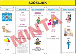 Bemutatás: Az oktató tabló segítségével megismerhetik a diákok a szófajokat, mint az ige, névszók, határozók, viszonyszók és az indulatszók. A felsorolt csoportok mindegyikéhez példákat sorolnak fel, így még könnyebb a tananyag elsajátítása. Az oktató tabló lemosható-műbőrre nyomtatott kivitelben kerül értékesítésre.
